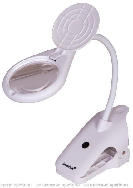 Линза бифокальная: по основному диаметру (90 мм) она дает увеличение в 2,5 крата, по дополнительному (21 мм) – 6 крат. Вокруг линзы расположена подсветка – 8 светодиодов, яркость которых можно регулировать. Для работы подсветки требуется подключение к сети переменного тока.