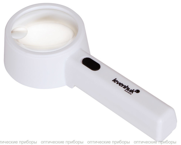 Линза сделана из пластика, оправа и ручка – тоже пластиковые. Переключатель подсветки расположен на ручке. Чтобы использовать подсветку, нужны батарейки (нет в комплекте).